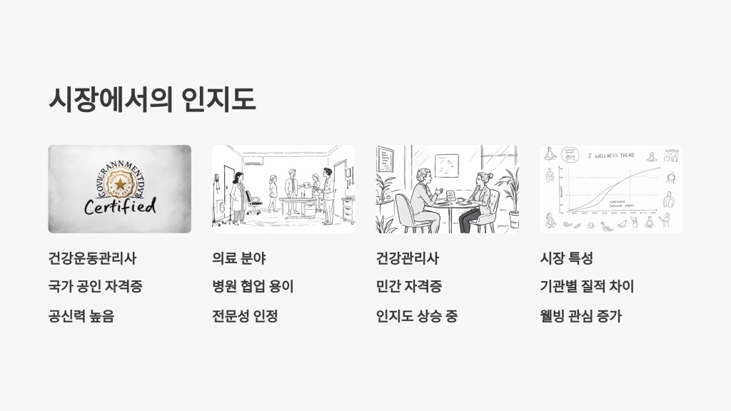 건강 운동관리사는 국가 공인 자격증으로 공신력이 높고, 의료 및 건강 관련 분야에서 잘 알려져 있습니다. 특히 병원 및 의료기관과의 협업이 용이하여 안정적인 직장과 전문성을 인정받을 가능성이 높습니다.