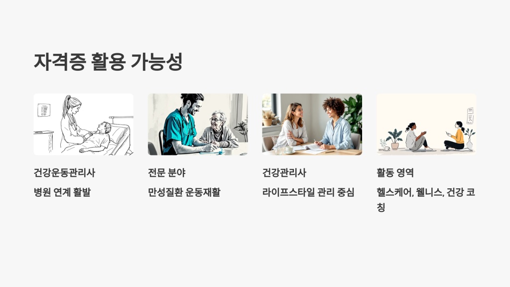 건강 운동관리사는 전문성이 높은 자격증으로, 다양한 분야에서 활용 가능합니다. 특히 병원 및 의료기관과의 연계가 활발하며, 만성 질환 환자의 운동 재활, 운동 처방 관련 업무를 주로 수행합니다. 또한 기업 내 건강 관리 프로그램 운영자, 스포츠 팀 트레이너, 헬스클럽 운영자 등 전문 운동 분야에서의 진로가 명확하게 구분됩니다.