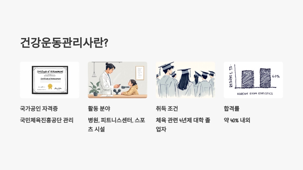 건강 운동관리사는 국민체육진흥공단에서 관리하는 국가공인 자격증으로, 운동과 건강을 전문적으로 관리하는 전문가입니다. 주로 병원, 피트니스센터, 스포츠 시설 등에서 활동하며, 만성질환 예방 및 재활을 위한 운동 프로그램 설계와 지도 역할을 맡습니다.