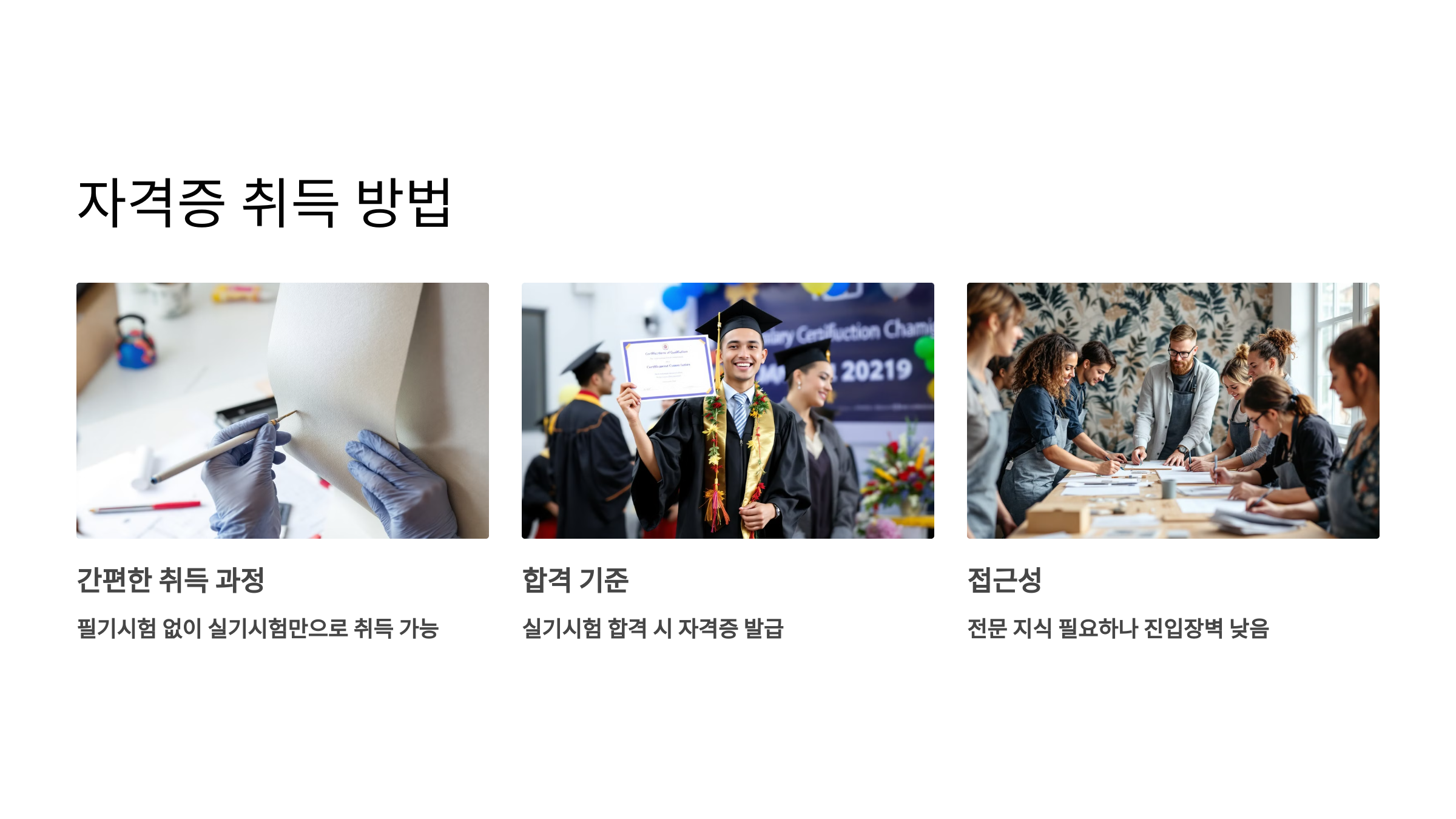 도배기능사는 건축 및 인테리어 업계에서 중요한 역할을 하는 자격증으로, 필기시험 없이 실기시험만으로 취득할 수 있어 빠르게 전문 기술을 익힐 수 있습니다. 특히, 숙련된 도배사는 높은 단가를 받을 수 있으며, 인테리어 업계 취업뿐만 아니라 도배 창업까지도 가능한 유망 직업입니다. 2025년 도배기능사 시험 일정에 맞춰 실기 연습을 철저히 준비하면 충분히 합격할 수 있으며, 체계적인 연습을 통해 높은 숙련도를 갖춘다면 더욱 경쟁력 있는 도배 전문가로 성장할 수 있습니다. 지금부터 시험 준비를 시작하여 안정적인 취업과 창업 기회를 잡아 보시기 바랍니다.
