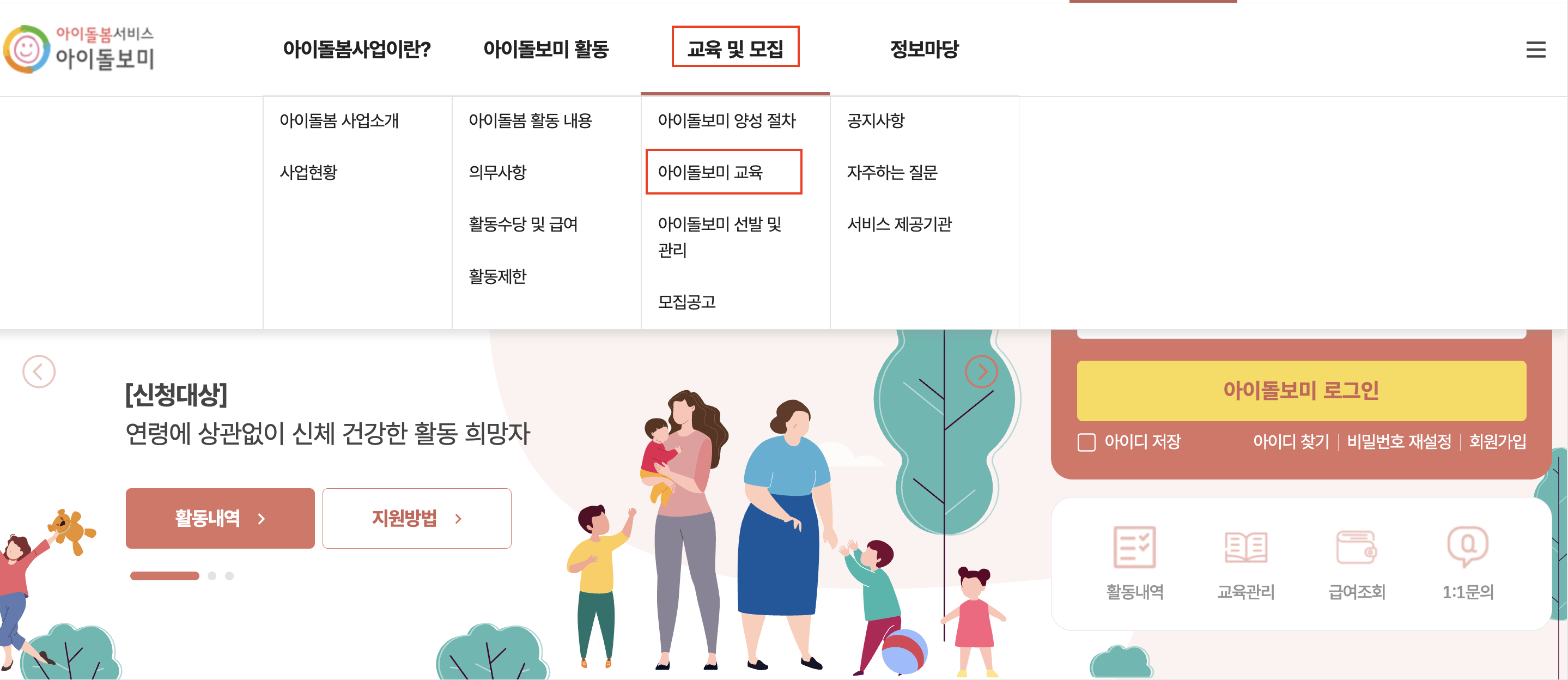 아이돌보미로 활동하려면 여성가족부에서 운영하는 아이 돌봄 서비스 교육을 이수해야 합니다.
