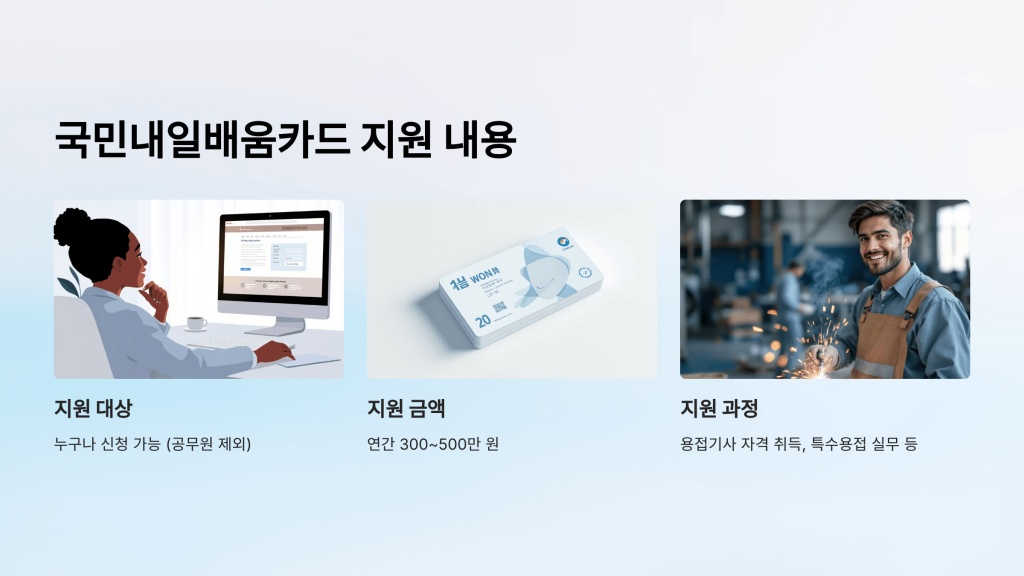 국민내일배움카드는 정부가 제공하는 직업훈련 지원제도입니다. 실업자, 재직자, 자영업자 등 누구나 신청할 수 있으며, 최대 300~500만 원까지 교육비를 지원받을 수 있습니다.