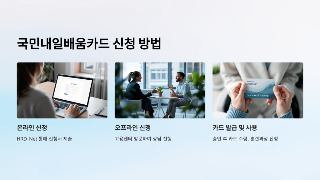 국민내일배움카드는 온라인 또는 고용센터 방문을 통해 신청할 수 있습니다.