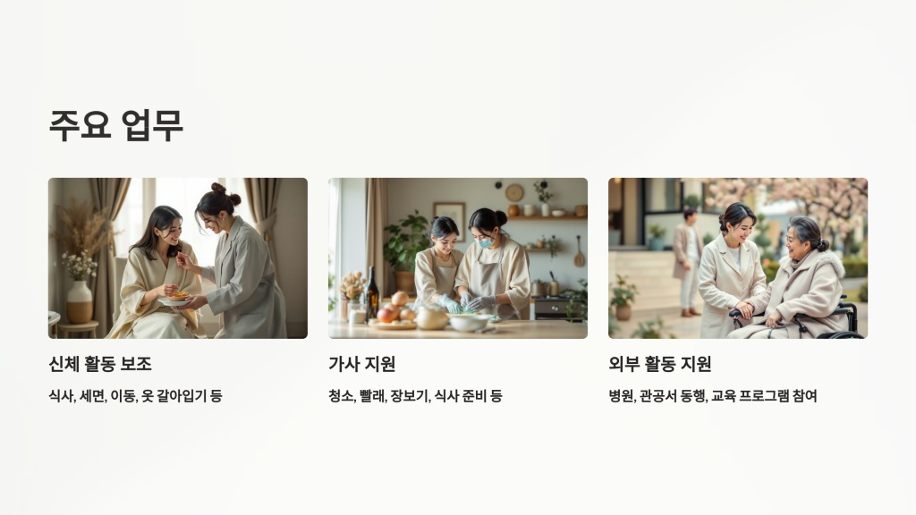 - 신체 활동 보조: 식사, 세면, 이동, 옷 갈아입기 등