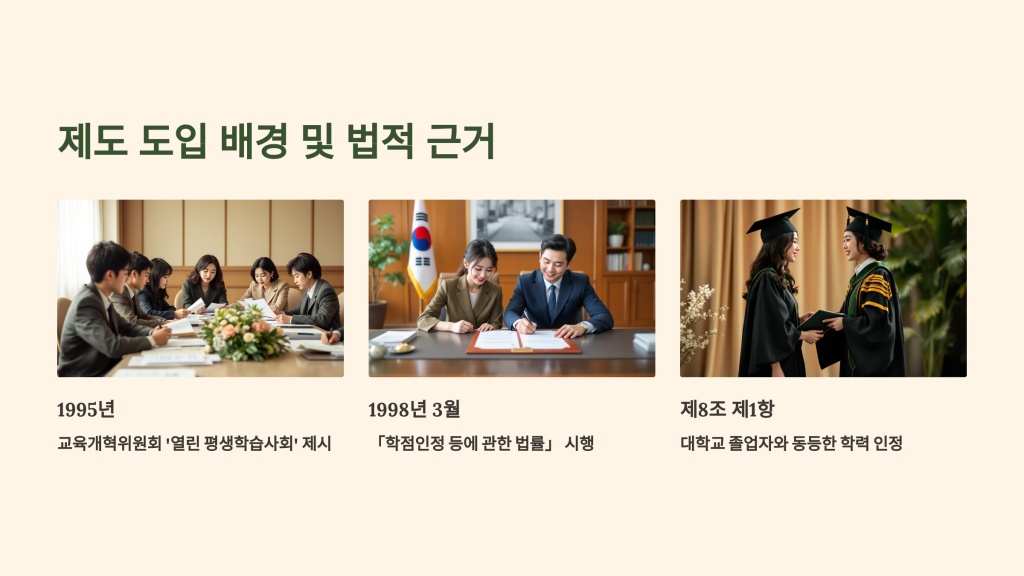 1995년 교육개혁위원회에서 ‘열린 평생학습사회’를 위한 새로운 교육체제를 제시하며 학점은행제를 도입했습니다.
